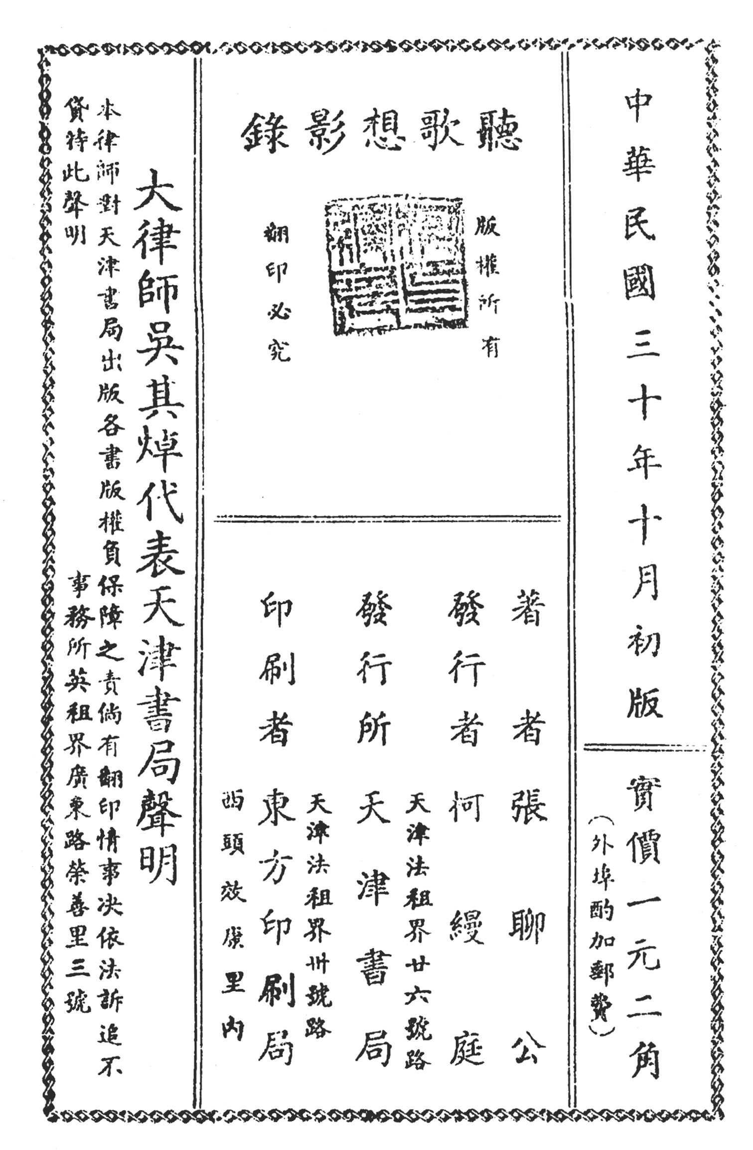 《听歌想影录》据天津书局1941年版影印。《歌舞春秋》据上海广益书局1951年版影印。两书的作者为著名剧评家、名票张聊公。《听歌想影录》是作者在北京观戏的记录,时间从 1913 年至 1918 年。《歌舞春秋》分上下两编,是作者在北京和天津观戏的记录。上编自 1916 年至 1924 年,是北京部分;下编从1929 年至1935 年,为天津部分。这两种书记录了民国初年北京各剧场演出京剧的盛况,以及诸多名角在台上的风采、演技等等。记载翔实,举凡伶官之沉浮、剧场之兴废,都有时间、地点可查,非一般传闻或间接所得者可比。