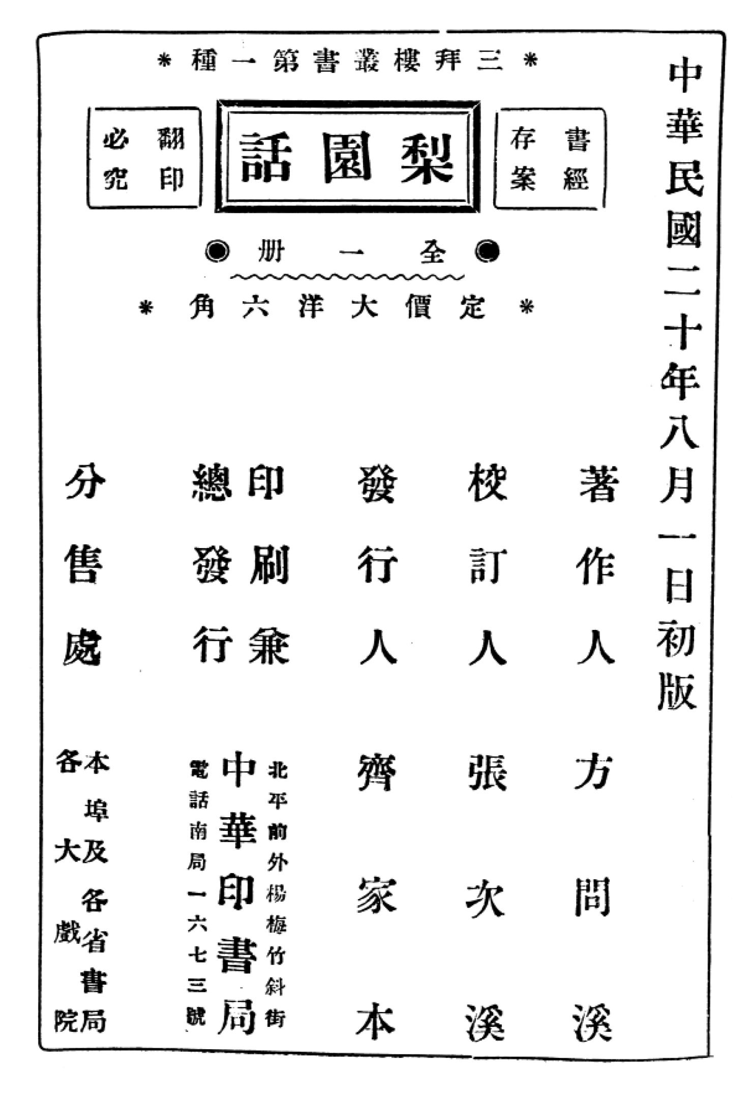 自詞曲興。而雜劇盛。千百年來。其間嬗變之跡。與夫梨園耆舊之前言往行足。資紀述者。何可勝道。方子問溪。綺年美才。傳其家學。近著梨園話一書。徵攷文献。裒列掌故。作梨園之考鏡比安石之碎金。茍非覃思研慮。曷克臻此。嘗考雜劇之於文學。最能發揚民族之精神。而鼓吹文學之優點。當今瀛海交通。中西文化有接近提攜之日。而雜劇遂有蒸蒸日上之勢。近自梅君游美。彼都人士。驚其才藝。而祈嚮亦大側重於此。問溪此編之出。不僅裨益梨園。行見闌出大秦。輝光世界。意中事也。問溪爲吾同門次溪之友。因次溪諈諉。且誦其書斐然美備。故樂爲之序而歸之。民國二十年鄭琬小耘。原版阅读