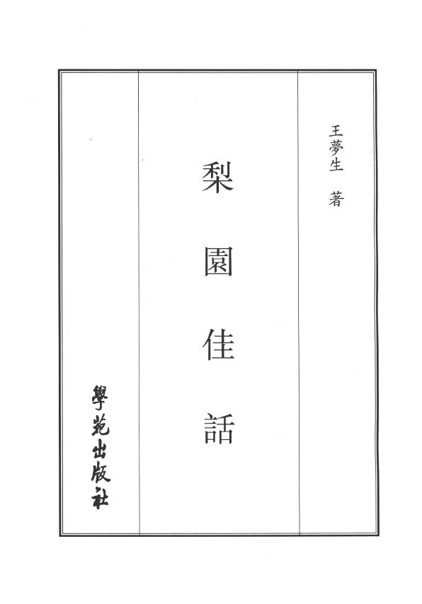 《梨园佳话》,据商务印书馆民国四年(1915年)版影印,王梦生著。主要介绍清末至民国初年北京地区的戏曲活动情况,并对当时众多京剧名家如程长庚、余三胜、汪桂芬、谭鑫培、孙菊仙、龚云甫等人的艺术成就进行了评论。内容多为一手材料,十分珍贵。