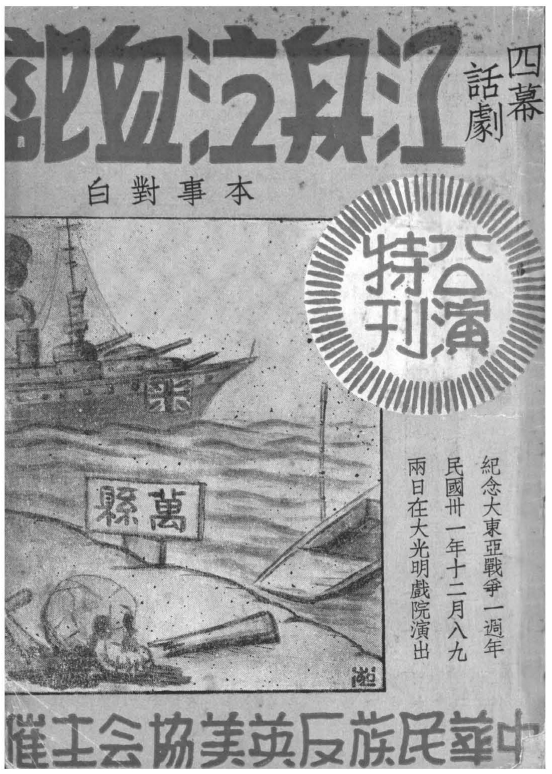 一般的話劇史書中,在提及《怒吼吧,中國》一劇時,必然曰是劇乃中國人民反抗外來侵略、捍衛民族利益的一部革命好戲云云。然而,仔細翻閱《申報》《新聞報》,便會發現1942年12月7日,汪僞政權爲了紀念所謂的『大東亞聖戰』周年慶,上海的話劇舞臺竟然也上演了該劇,只是將劇名改成了《江州泣血記》。原版阅读