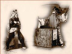 《闹朝扑犬》翁偶虹饰屠岸贾(左),说书红饰赵盾(右)