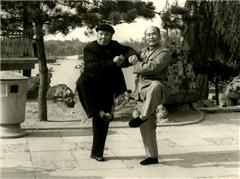 侯玉山在陶然亭公园和北方昆曲剧院老艺人吴祥珍说戏——《丁甲山》中李逵和燕青的亮相(陈家让摄)