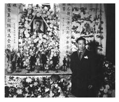 梅兰芳在上海发起祭奠仪式,并亲自伫立李世芳遗像前为其守灵(身后是梅兰芳亲笔撰写的挽联)。